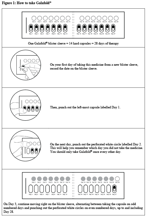 Galafold® is available in a blister pack containing 14 capsules.