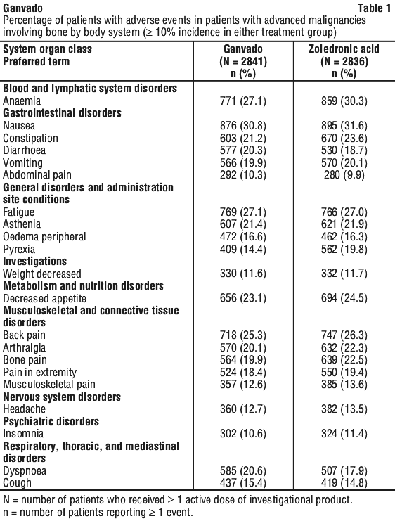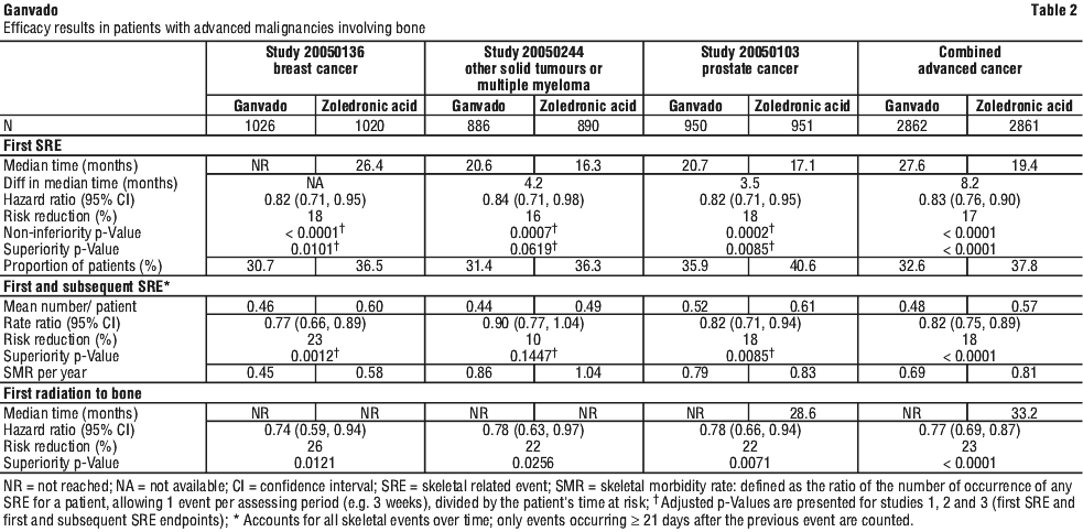 In a post hoc analysis of Study 20050244 (including solid tumours, excluding multiple myeloma), Ganvado reduced the risk of developing a SRE by 19% (p = 0.0168) and developing multiple SREs by 15% (p = 0.0479) compared with zoledronic acid with the median time to first SRE delayed by 6 months.