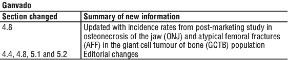 GANVADO is used to prevent serious bone complications in adults with multiple myeloma or in adults with bone metastasis caused by solid tumour cancer; to treat giant cell tumour of bone which cannot be treated by surgery, where surgery is not the best option, or which has returned after treatment in adults or adolescents whose bones have stopped growing; or to reduce high levels of calcium in the blood in cancer patients if bisphosphonates do not work.