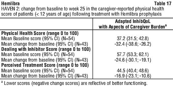 In the intra-patient interim analysis, weekly Hemlibra prophylaxis resulted in a clinically meaningful (98%) reduction in bleed rate for treated bleeds in 18 paediatric patients who had at least 12 weeks of Hemlibra prophylaxis compared to their bleed rate collected in the NIS prior to enrolment (Table 15).