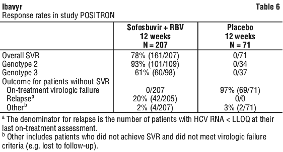 The difference in the overall SVR rates between sofosbuvir + ribavirin and peginterferon alfa + ribavirin treatment groups was 0.3% (95% confidence interval: -7.5% to 8.0%) and the study met the predefined noninferiority criterion. Among the small number of Black/African Americans enrolled in the trial, 75% (9/12) of patients achieved SVR in the sofosbuvir + ribavirin treatment group compared to 40% (2/5) in the peginterferon alfa + ribavirin treatment group.