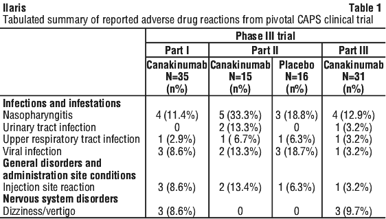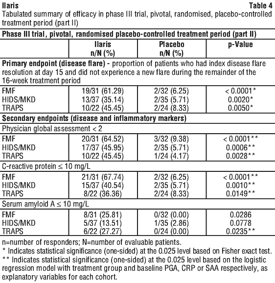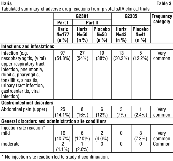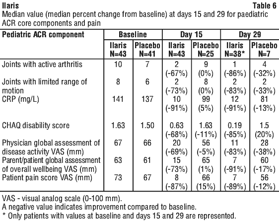 Ilaris treatment improved components of paediatric ACR core set as compared to placebo at Days 15 and 29 (Table 6). All patients treated with Ilaris had no fever at day 3 compared to 86.8% of patients treated with placebo (p=0.0098).