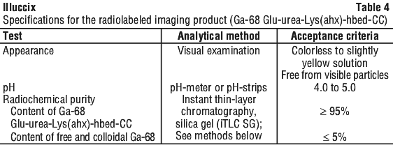 The prepared Ga-68 Glu-urea-Lys(ahx)-hbed-CC injection for intravenous use is a sterile, pyrogen free, clear, colourless, buffered solution with a pH between 4.0-5.0.