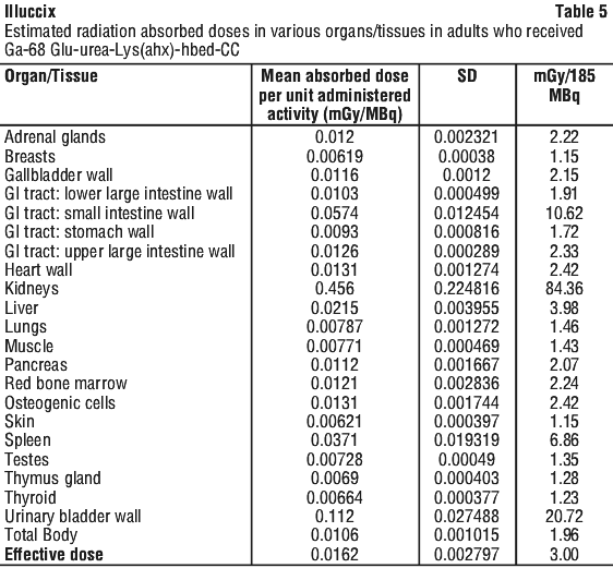 The recommended amount of activity to be administered intravenously is 185 MBq (5 mCi) with a range of 166.5 to 203.5 MBq (4.5 to 5.5 mCi) and a maximum dose of 25 microgram of Glu-urea-Lys(ahx)-hbed-CC.