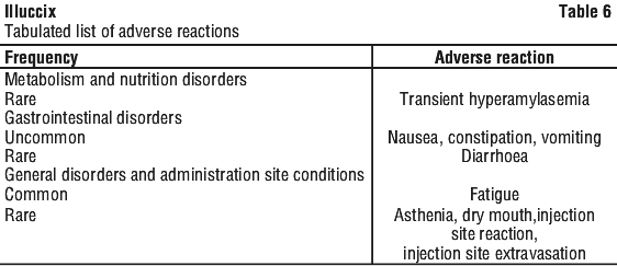 The following list of adverse reactions is based on experience from clinical trials and in available literature. Adverse reactions are displayed by system organ class and frequency in Table 6 and defined as very common (≥ 1/10), common (≥ 1/100 to < 1/10), uncommon (≥ 1/1,000 to < 1/100), rare (≥ 1/10,000 to < 1/1,000), very rare (< 1/10,000) and not known (cannot be estimated from the available data).