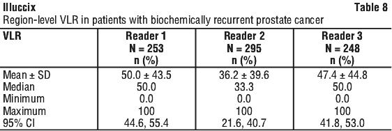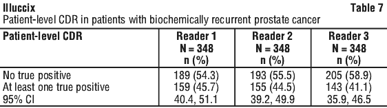 A total of 422 adult patients (mean age 68.4) with biochemical recurrence were evaluated with Ga-68 Glu-urea-Lys(ahx)-hbed-CC PET. All patients had biopsy proven prostate cancer that had been treated with curative intent and who presented with rising PSA. The mean age was 68 years, 93% were white, 80% had had prior prostatectomy, and mean baseline PSA was 11 nanogram/mL. Each participant received a single 68Ga Glu-urea-Lys(ahx)-hbed-CC PET from mid-thigh to skull base. The mean activity dose administered was 244 MBq and scans were performed on average 70 minutes after administration. There were 295 participants who received 68Ga Glu-urea-Lys(ahx)-hbed-CC as prepared using the Illuccix kit and 127 who received 68GA Glu-urea-Lys(ahx)-hbed-CC prepared by an alternate method. The images were read by three independent readers blinded to clinical and conventional imaging information. Diagnostic performance of Ga-68 Glu-urea-Lys(ahx)-hbed-CC in localizing tumor sites was assessed in 348 patients for whom a composite truth standard using biopsy/histopathology and/or conventional imaging was available. The co-primary efficacy endpoints were patient-level correct detection rate (CDR) and region-level verified localization rate (VLR). Patient-level CDR was defined as the percentage of patients who have at least one true positive lesion exactly localized between PET imaging and the reference standard, regardless of any coexistent false positive findings, out of all patients scanned and for whom a reference standard was available. Region-level VLR was defined as the percentage of regions containing at least one TP lesion (exactly localized correspondence between PET imaging and the reference standard), regardless of any co-existent FP findings within the same region, out of all regions containing at least one PET-positive finding. The regions evaluated include prostate bed, pelvic lymph nodes, skeleton, and other distant sites (extra-pelvic lymph nodes and viscera). Table 7 and Table 8 show the CDR and VLR of Ga-68 Glu-urea-Lys(ahx)-hbed-CC. The CDR results for the 3 independent readers ranged from 41.1% to 45.7%, all of which were significantly greater than the prespecified 20% threshold. The VLR results for the 3 independent readers ranged from 36.2% to 50%, all of which were significantly greater than the prespecified threshold of 10%. The results of the independent reads were generally consistent with one another.