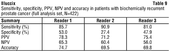 Ga-68 Glu-urea-Lys(ahx)-hbed-CC sensitivity, specificity, PPV, NPV, and accuracy are presented by reader in Table 9.