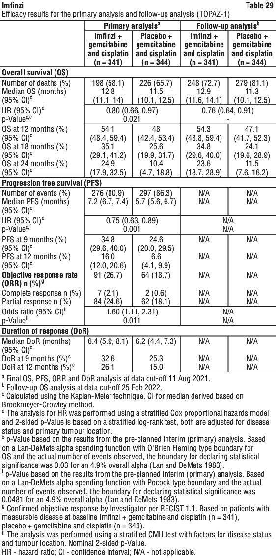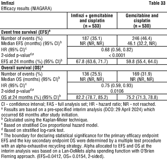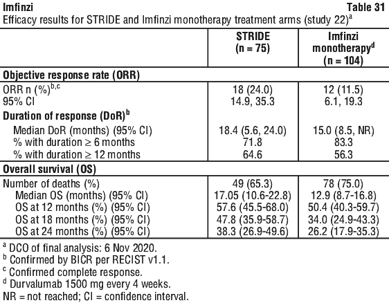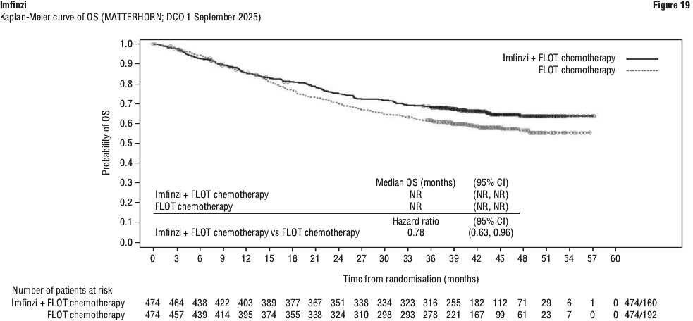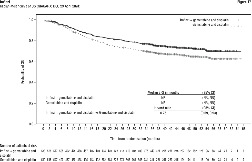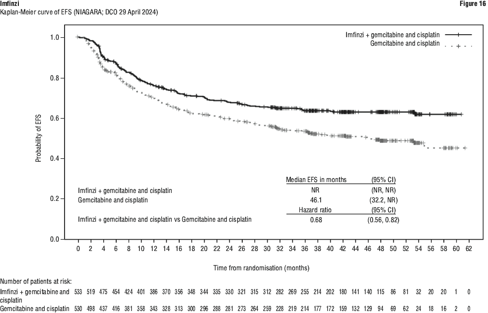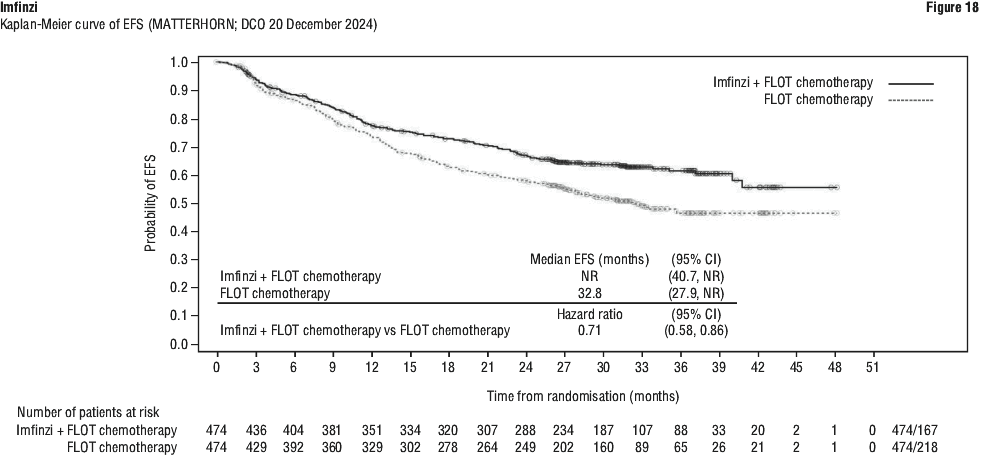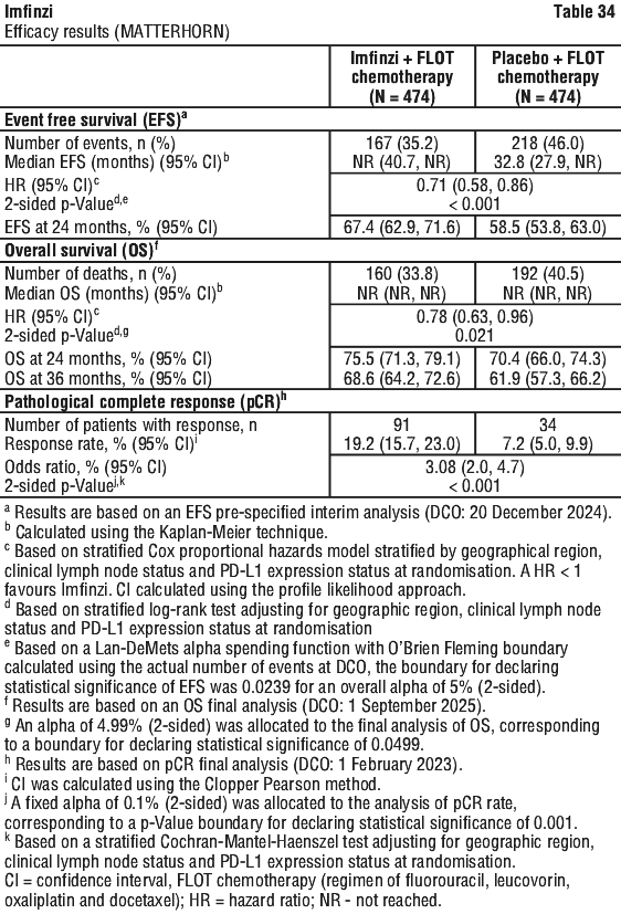 The study demonstrated a statistically significant and clinically meaningful improvement in EFS of the Imfinzi arm compared to the placebo arm. The study also demonstrated a statistically significant and meaningful improvement in pCR of the Imfinzi arm compared to the placebo arm. OS data were not mature at the time of EFS analysis. See Table 25 and Figure 1.