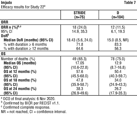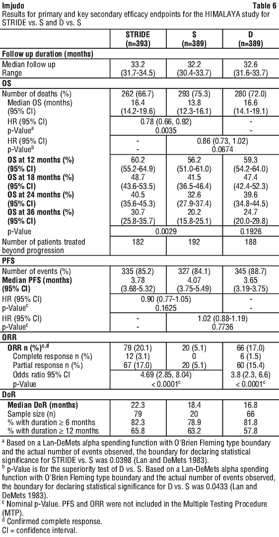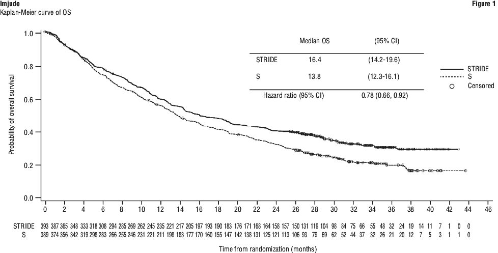 Treatment continued as long as clinical benefit was observed or until unacceptable toxicity. Patients in all arms could continue to receive treatment after evidence of disease progression if, in the Investigator's opinion, they were benefiting from study drug and met all inclusion and exclusion criteria for treatment beyond progression. In addition, patients in the STRIDE arm who continued treatment beyond progression were allowed to be rechallenged once with an additional single dose of Imjudo 300 mg after cycle five of durvalumab. Of the 182 patients enrolled to the STRIDE arm who received durvalumab beyond progression, the median OS was 19.5 months (95% CI: 15.4, 23.4). Of the 30 patients who were enrolled to the STRIDE arm who were rechallenged with Imjudo, the median OS was 30.4 months (95% CI: 23.4, NR).