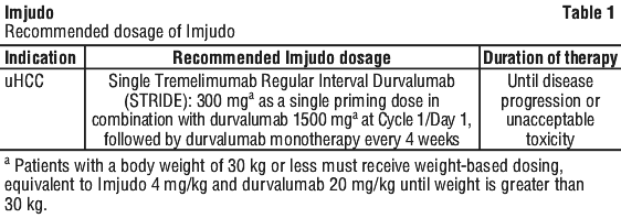 Imjudo in combination with durvalumab is indicated for the treatment of adult patients with unresectable hepatocellular carcinoma (uHCC) who have not received prior treatment with a PD-1/PD-L1 inhibitor.4.2 Dose and Method of Administration