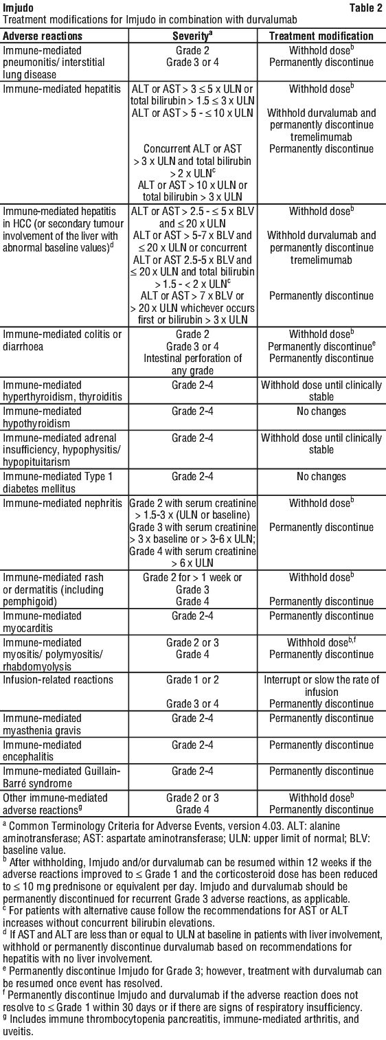 For suspected immune-mediated adverse reactions, adequate evaluation should be performed to confirm aetiology or exclude alternate aetiologies. Based on the severity of the adverse reaction, Imjudo or Imjudo in combination with durvalumab should be withheld and corticosteroids administered. Upon improvement to ≤ Grade 1, corticosteroid taper should be initiated and continued over at least 1 month. Consider increasing dose of corticosteroids and/or using additional systemic immunosuppressants if there is worsening or no improvement.