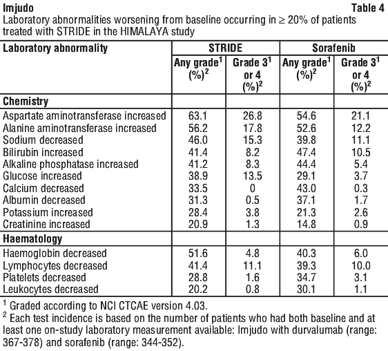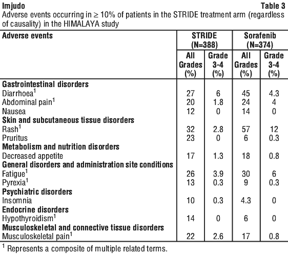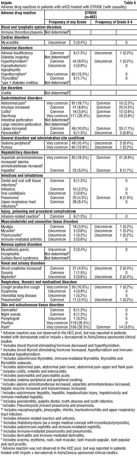 The safety of Imjudo administered in combination with durvalumab was evaluated in a total of 388 patients with uHCC in HIMALAYA, a randomised, open-label, multicentre study (see Section 5.1 Pharmacodynamic Properties, Clinical trials). Patients received Imjudo 300 mg administered as a single intravenous infusion in combination with durvalumab 1,500 mg on the same day, followed by durvalumab every 4 weeks or sorafenib 400 mg given orally twice daily.