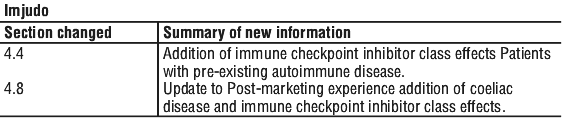 The Imjudo Consumer Medicine Information (CMI) should be provided to the patient prior to administration of the first dose of Imjudo.
