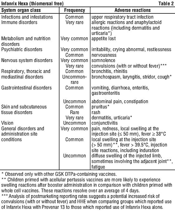 INFANRIX HEXA helps protect most children from diphtheria, tetanus, pertussis, hepatitis B, poliovirus infection and Haemophilus influenzae type b, but it may have unwanted side effects in a few children. All medicines and vaccines can have side effects. Sometimes they are serious; most of the time they are not. Some side effects may need medical treatment. The chance of your child having a serious side effect is very much less than the chance of your child having a permanent injury from the natural infections.