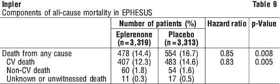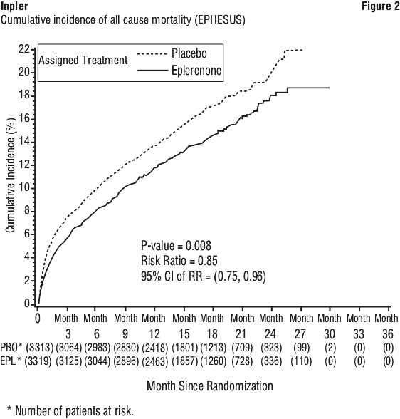 The reduction in mortality observed in patients treated with eplerenone compared to those who received placebo is mainly the result of a reduction in the rate of sudden death after myocardial infarction. In the first 12 months of treatment the rate of all cause mortality was 11.68% among patients treated with eplerenone compared to 13.63% for patients treated with placebo. Among patients who remained alive after 12 months of therapy, the all cause mortality rates at month 27 in the eplerenone and placebo groups were 7.97% and 9.58%, respectively.