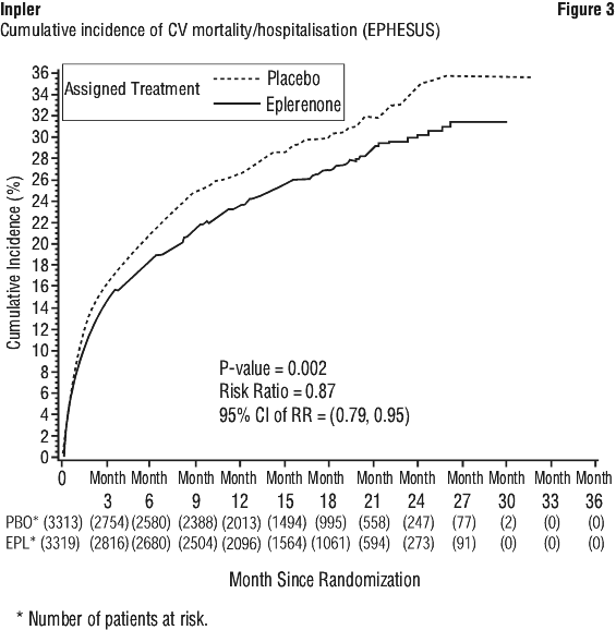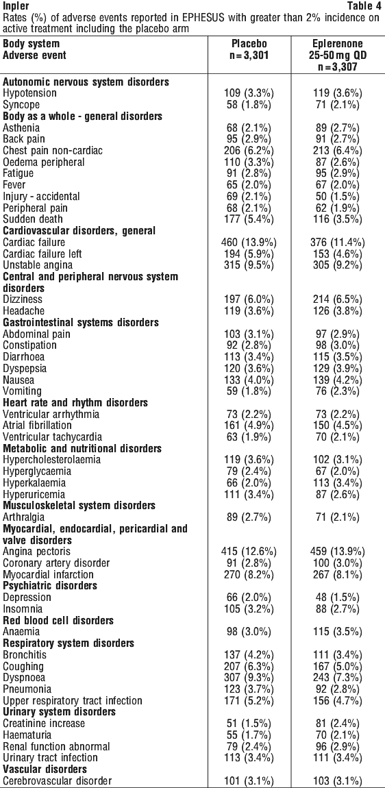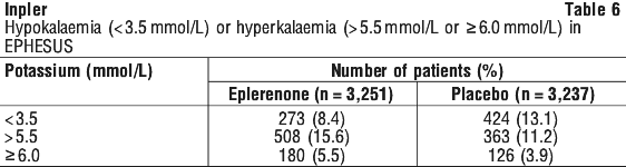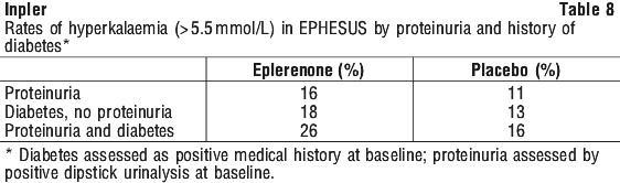 Table 8 shows the rates of hyperkalaemia in EPHESUS as assessed by two baseline characteristics: presence/absence of proteinuria from baseline urinalysis and presence/absence of diabetes (see Section 4.4 Special Warnings and Precautions for Use, Hyperkalaemia).