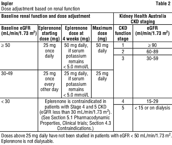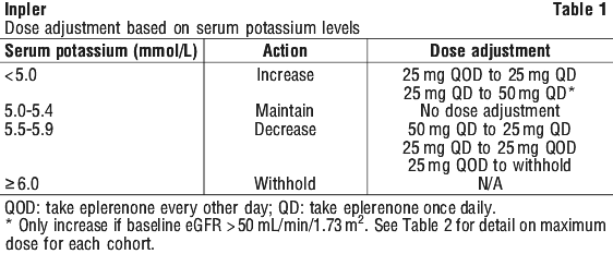 Eplerenone should be suspended when serum potassium is ≥ 6.0 mmol/L. It can be restarted at a dose of 25 mg every other day when serum potassium levels have fallen below 5.0 mmol/L. Serum potassium monitoring should continue once eplerenone has been re-started again.