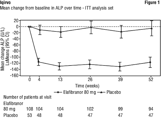 The efficacy of elafibranor was evaluated in Study GFT505B-319-1 (ELATIVE), a phase 3, randomised, DB, placebo-controlled study followed by an open-label long-term extension (OLE) in 161 adults with PBC with an inadequate response or intolerance to UDCA. Participants were randomized in a 2:1 ratio to receive elafibranor 80 mg or placebo once daily for at least 52 weeks. When applicable, participants continued their pre-study dose of UDCA throughout the study. Participants were included in the study if their ALP was ≥ 1.67 x ULN and total bilirubin (TB) was ≤ 2 x ULN. Participants were excluded in case of decompensated cirrhosis or other causes of liver disease.