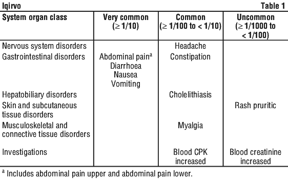 The most common adverse events with Iqirvo in the clinical study (reported in ≥ 5% and higher compared to placebo) were weight gain, arthralgia, constipation, muscle injury, fracture, gastroesophageal reflux disease, dry mouth, weight loss, and rash.