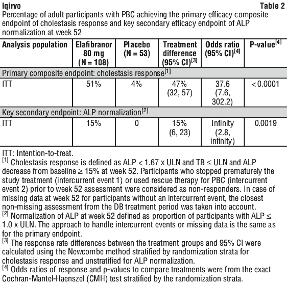 Table 2 shows the primary composite endpoint of cholestasis response and the key secondary endpoint of ALP normalization.