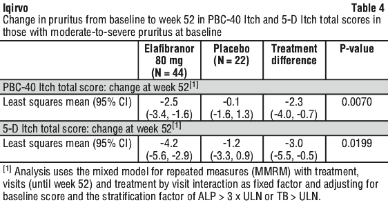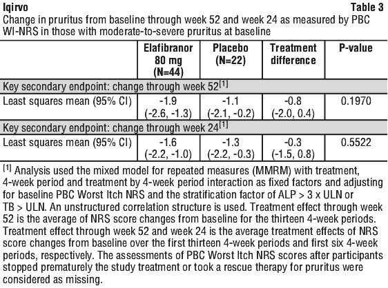 In participants with moderate-to-severe pruritus at baseline, the mean change from baseline in PBC Worst Itch NRS score through Week 52 and Week 24 decreased in participants randomized to elafibranor compared to placebo but did not reach statistical significance (Table 3).