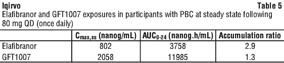 Elafibranor plasma exposure (AUC) increases proportionally from 50 to 360 mg (0.6 to 4.5 times the recommended dosage). Steady-state is achieved by day 14 following once daily dosing. The pharmacokinetics (PK) of elafibranor and its major active metabolite GFT1007 was found to be time-independent after 16-day repeated administration. Elafibranor and its active metabolite exposure in participants with PBC are listed in Table 5.