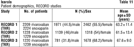 EINSTEIN-DVT (see Table 17) met its principal objective, demonstrating that Ixarola was noninferior to enoxaparin/ VKA for the primary outcome of symptomatic recurrent VTE (HR of 0.68 [95% CI = 0.44-1.04], p < 0.001). The prespecified test for superiority was not statistically significant (p = 0.0764). The incidence rates for the principal safety outcome (major or clinically relevant nonmajor bleeding events), as well as the secondary safety outcome (major bleeding events), were similar for both groups (HR of 0.97 [95% CI = 0.76-1.22], p = 0.77 and HR of 0.65 [95% CI = 0.33-1.30], p = 0.21, respectively). The predefined secondary outcome of net clinical benefit, (the composite of the primary efficacy outcome and major bleeding events), was reported with a HR of 0.67 ([95% CI = 0.47-0.95], p = 0.03) in favour of Ixarola.