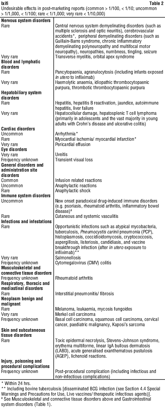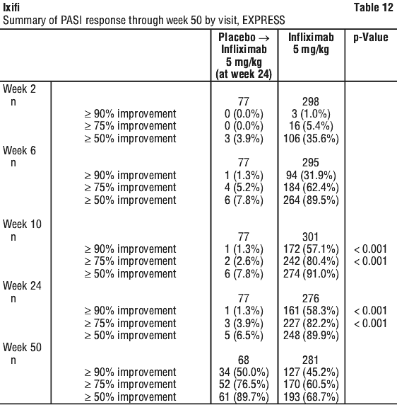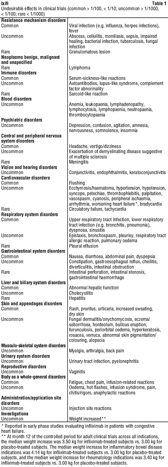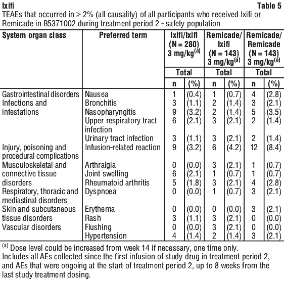 Experience from intermittent treatment with Ixifi in psoriasis after a period of no treatment suggests reduced efficacy and a higher incidence of infusion reactions when compared to the approved dosing guidance (see Section 4.4 Special Warnings and Precautions for Use; Section 4.8 Adverse Effects (Undesirable Effects)).