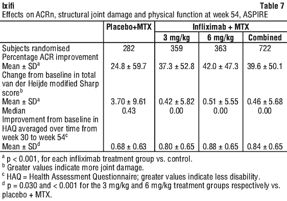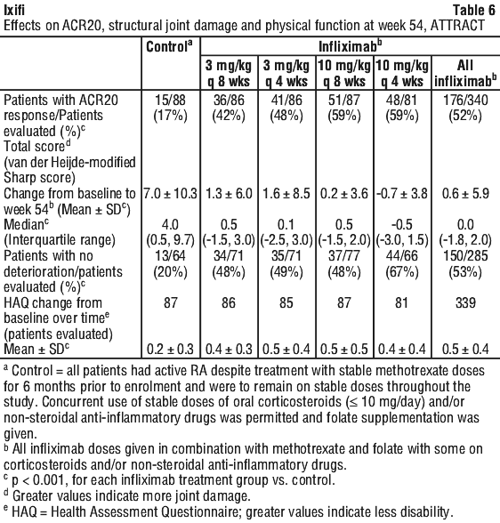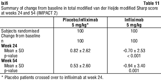 Radiographic changes were assessed in the IMPACT 2 study. Radiographs of both the hands and feet were collected at baseline, Weeks 24 and 54 in all patients. Infliximab treatment inhibited the progression of structural damage compared with placebo treatment at the Week 24 primary endpoint as measured by change from baseline in total modified vdH-S score. Differences between infliximab and placebo groups at Week 24 were statistically significant for total modified vdH-S score, hands, feet, erosion and joint space narrowing (JSN) scores. Significantly more subjects in the placebo group had readily apparent radiographic progression at Week 24 in total modified vdH-S, erosion, and JSN scores compared with the proportion of subjects in the infliximab group. The maintenance of radiographic benefit was observed through 1 year.