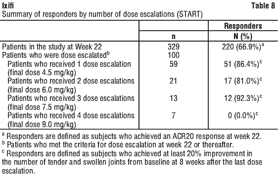 Based on the comparative clinical efficacy and safety results obtained in Study B5371002 in subjects with RA, it is concluded that biosimilarity was demonstrated between Ixifi and Remicade. The totality of evidence supports that Ixifi is biosimilar to Remicade.