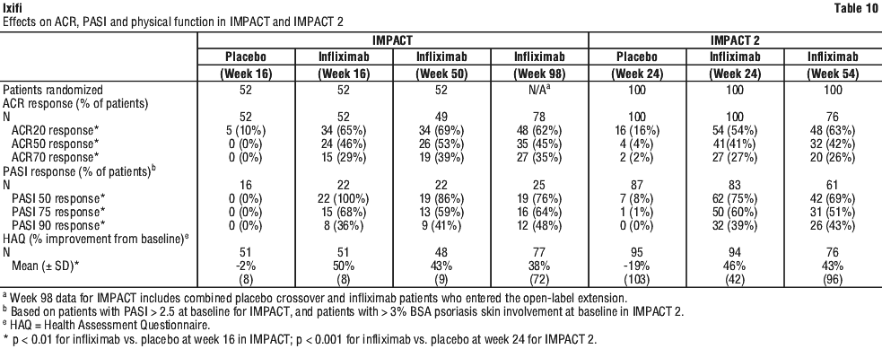 In the IMPACT and IMPACT 2 studies, 31% and 12% respectively of patients randomised to infliximab at baseline achieved a major clinical response (defined as achieving an ACR70 response at all visits for a continuous 24-week period) at Week 98 and Week 54 respectively.