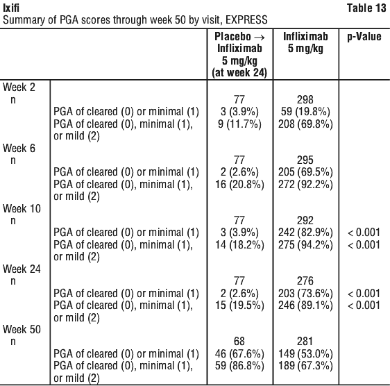 At Week 10, 82.9% of infliximab patients achieved a PGA score of minimal or cleared compared to 3.9% of placebo patients (p < 0.001). PGA scores at Weeks 6, 10, 24 and 50 are presented in Table 13.