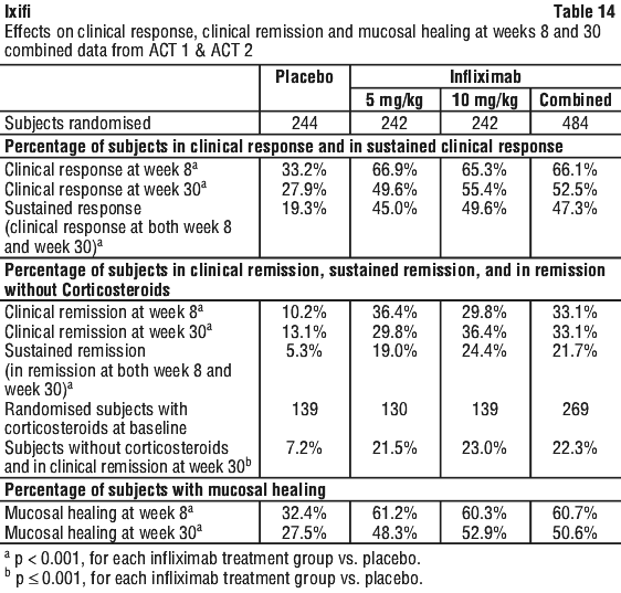 Additionally, at Weeks 8 and 30, a significantly greater proportion of patients in the 5 mg/kg and 10 mg/kg dose groups in ACT 1 and ACT 2 achieved mucosal healing compared to patients in the placebo group. The proportion of subjects with mucosal healing was similar between the 2 infliximab dose groups in the two studies (see Table 14).