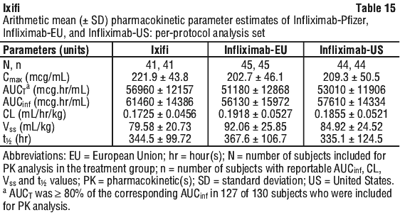 The arithmetic mean (± SD) PK parameters for infliximab-Pfizer, infliximab-EU, and infliximab-US are summarised in Table 15. Consistent with the concentration-time profiles, the mean Cmax, AUCT and AUCinf estimates were similar among the 3 study drugs. In addition, the inter-subject variability for each of the PK parameters was similar across the 3 study drugs, with %CV values of 20% to 24%, 21% to 25%, and 23% to 28% for Cmax, AUCT and AUCinf, respectively.