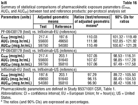 The 90% CIs for test-to-reference ratios of Cmax, AUCt, and AUCinf were all contained within the pre-specified acceptance boundaries of 80.00% to 125.00% for the comparisons of PF-06438179 to infliximab-US, PF-06438179 to infliximab-EU, and infliximab-EU to infliximab-US. This study demonstrated the PK similarity of infliximab-Pfizer to both infliximab-US and infliximab-EU, and of infliximab-EU to infliximab-US. See Table 16.