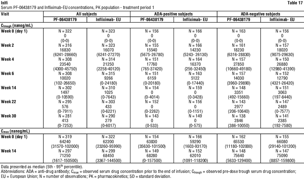 In Study B5371002, the median Ctrough and Cmax values, as well as the corresponding ranges, were similar between the PF-06438179 and infliximab-EU arms during treatment period 1 with contributions from subjects who differed in numbers over the assessment time points. The concentrations of serum PF-06438179 and infliximab-EU were lower in ADA-positive subjects compared to ADA-negative subjects. The effect of ADA on PK in ADA-positive subjects was similar between treatment arms in all three treatment periods. See Table 17.