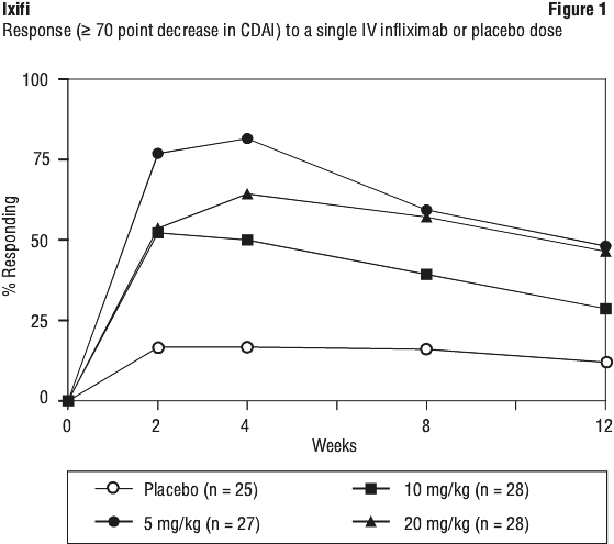In the single dose trial of 108 patients, 22 of 27 (81%) of the infliximab-treated patients receiving a 5 mg/kg dose achieved a clinical response (decrease in CDAI by ≥ 70 points) vs. 4 of 25 (16%) of the placebo-treated patients (p < 0.001). Also at Week 4, 13 of 27 (48%) of infliximab-treated patients achieved a clinical remission (CDAI < 150) vs. 1 of 25 (4%) of placebo-treated patients. Results are shown in Figure 1.
