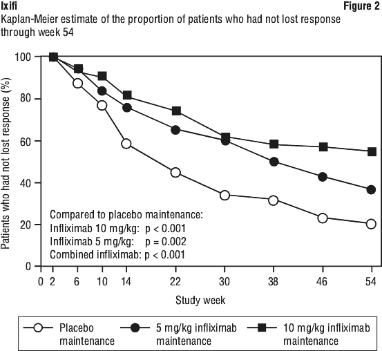 At Week 2, 58% (335/573) of patients had responded to a single infusion of infliximab and were in clinical response (decrease in CDAI ≥ 25% and ≥ 70 points). At Week 30, 23 of 110 (21%) of placebo patients were in remission, compared with 44 of 113 (39%) of 5 mg/kg maintenance group (p=0.003) and 50 of 112 (45%) (p=0.0002) of 10 mg/kg maintenance group. Patients in the infliximab maintenance groups had significantly longer time to loss of response than patients in the placebo maintenance group (p < 0.001) (Figure 2). Median time to loss of response was 46 weeks in the combined infliximab maintenance treatment group versus 19 weeks in the placebo maintenance group. Patients who achieved a response and subsequently lost response were eligible to receive infliximab on an episodic basis at a dose that was 5 mg/kg higher than the dose to which they were randomised. Eighty-nine percent (50/56) of patients who lost clinical response on infliximab 5 mg/kg every-eight-week maintenance dosing, responded to a 10 mg/kg infliximab infusion.