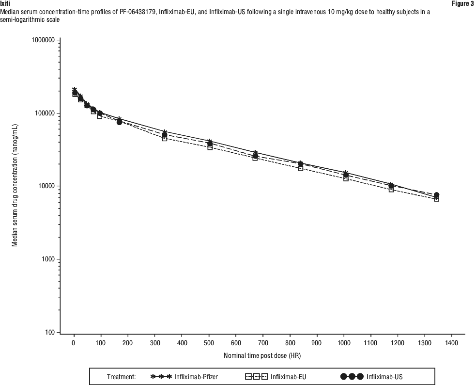 The PK similarity of Ixifi (PF-06438179, Infliximab Pfizer) and Remicade was evaluated in the clinical development program. Study B5371001 was a three-arm, double-blind, randomised (1:1:1), parallel-group, single-dose study that compared the PK of PF-06438179, infliximab-EU and infliximab-US following IV administration of 10 mg/kg to healthy adult subjects.