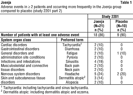 In Study 2201 Part 2, the most common adverse events (> 10%) were headache, sinusitis, and atopic dermatitis. Adverse events occurring in ≥ 2 Joenja-treated patients and occurring more frequently than placebo are shown in Table 1.