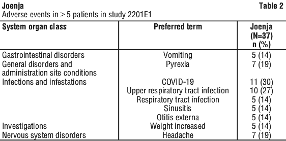 Table 2 summarizes safety data from Study 2201E1, an open-label, long term extension study. Thirty-seven patients received Joenja 70 mg orally twice daily for at least 60 weeks and 81% were exposed for 96 weeks or longer. Median duration of Joenja treatment was approximately 3 years, and 5 patients had more than 5 years of Joenja exposure.
