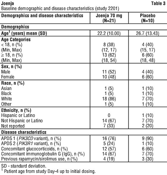 The efficacy of Joenja was assessed in Study 2201, a 12-week randomised, blinded, placebo-controlled study in 31 patients with confirmed APDS-associated pathogenic variant in either PIK3CD or PIK3R1. Patients were randomized 2:1 to receive either Joenja 70 mg or placebo twice a day. Patient demographics at baseline are presented in Table 3.