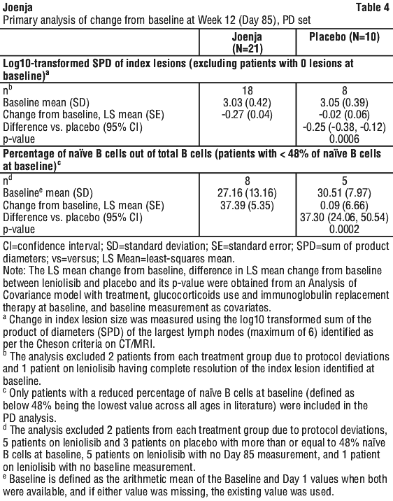 In a supportive analysis of naïve B cells in the pharmacodynamic analysis (PD) set (including patients with naïve B cells > 48% at baseline), the adjusted mean difference between the two treatment groups (95% CI) on change from baseline at Day 85 was 27.94 (15.02, 40.85); the 2-sided p-value observed for Joenja (N=13) vs placebo (N=8) was p=0.0003.
