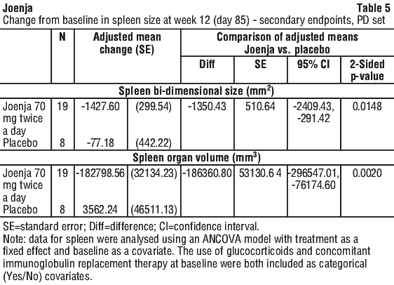 Secondary endpoints were supportive of improvement in lymphoproliferation, with significant reduction in spleen size (see Table 5).