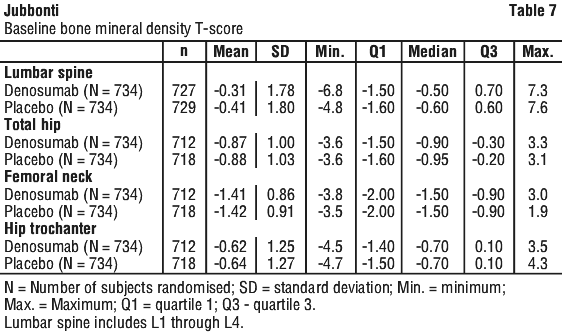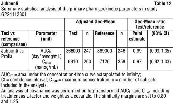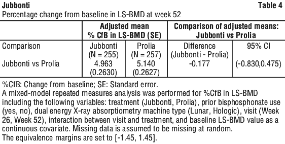 JUBBONTI contains the active ingredient denosumab. JUBBONTI is used to improve bone density and to reduce your risk of fracture. It is used to treat bone loss in women with osteoporosis after the menopause, men with osteoporosis, and men with prostate cancer who have reduced testosterone level caused by surgery or treatment with drugs. It is also used to improve bone density in patients treated with corticosteroids.
