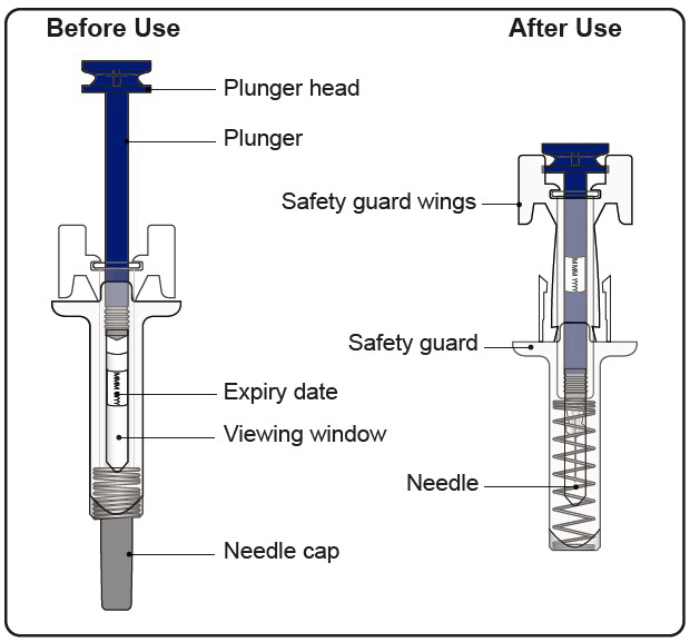 Each pack contains one ready to use single-use pre-filled syringe and one calendar card with a sticker.