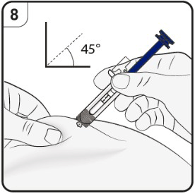 Gently pinch the skin at the injection site and hold the pinch throughout the injection. With the other hand insert the needle into the skin at an angle of approximately 45 degrees as shown.