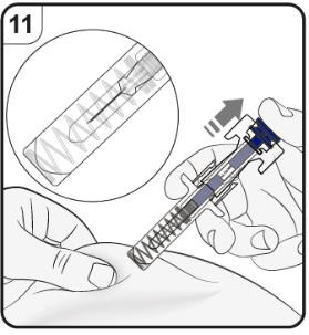 Keeping the pre-filled syringe at the injection site, slowly release the plunger until the needle is covered by the safety guard.