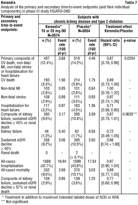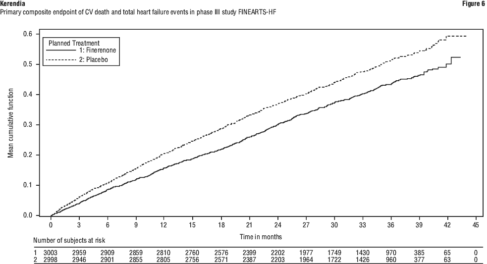 The study analysed 6001 patients randomly assigned to receive either Kerendia (N = 3003) or placebo (N = 2998), with a median follow-up duration of 2.7 years. The study included 3247 (54%) patients with a heart failure event in the past 3 months, including 1219 (20%) patients randomized during the hospitalisation or within 7 days of discharge. At month 24 of the subjects treated with Kerendia, 35% were treated with 40 mg once daily, 32% with 20 mg once daily, 12% with 10 mg once daily and 1% were on a treatment interruption. At any time during treatment, approximately 80% of the patients reached their target dose. After the end of study notification, vital status was obtained for 99.7% of patients. The trial population was 79% White, 17% Asian, and 1.5% Black. The mean age at enrolment was 72 years and 46% of patients were female. At baseline, the mean LVEF was 53%, with 64% of patients having an LVEF ≥ 50%, and 69% and 30% of patients were NYHA class II and III, respectively. Mean blood pressure was 129/75 mmHg while mean body mass index (BMI) was 30 kg/m2. The median NT-proBNP was 1041 picogram/mL, the mean eGFR was 62 mL/min/1.73 m2 with 48% of patients having an eGFR < 60 mL/min/1.73 m2, and the median urinary albumin-to-creatinine ratio (UACR) was 18 mg/g. Atrial fibrillation was present for 38% of patients and 41% had diabetes mellitus. The majority of patients were on loop diuretics (87%), an angiotensin-converting enzyme inhibitor (ACEi) or angiotensin receptor blocker (ARB) (79%), or an angiotensin receptor neprilysin inhibitor (ARNI) (9%), and 14% were on sodium-glucose cotransporter 2 (SGLT2) inhibitors.
