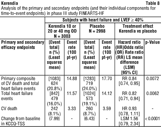 Heart failure. Kerendia was investigated in a randomised, double-blind, placebo-controlled, multicentre phase III study, FINEARTS-HF. The effect of Kerendia on cardiovascular outcomes was evaluated in adults with heart failure receiving either Kerendia 10 mg, 20 mg, or 40 mg once daily, or placebo.